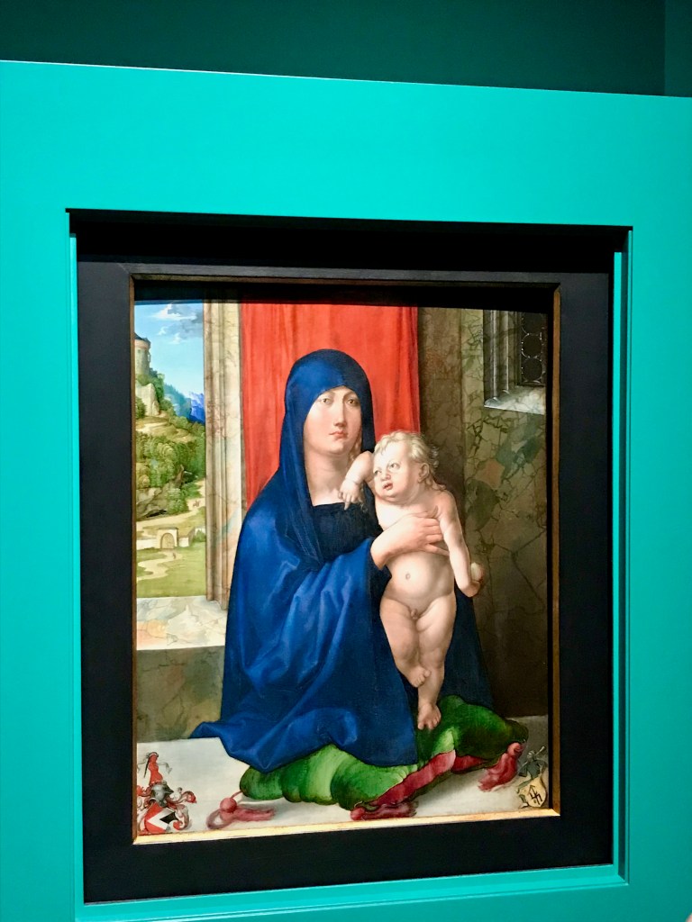 There is another cultural overlay. This painting is called the Haller Madonna, after the family who commissioned the work for their private worship. It features coats of arms in the lower corners, representing prominent families from Dürer’s home town of Nuremberg. The husband’s arms in the left corner represent a noble family while his wife’s on the right are a mason’s mark showing she came from an artisan family. She was moving up in the world!