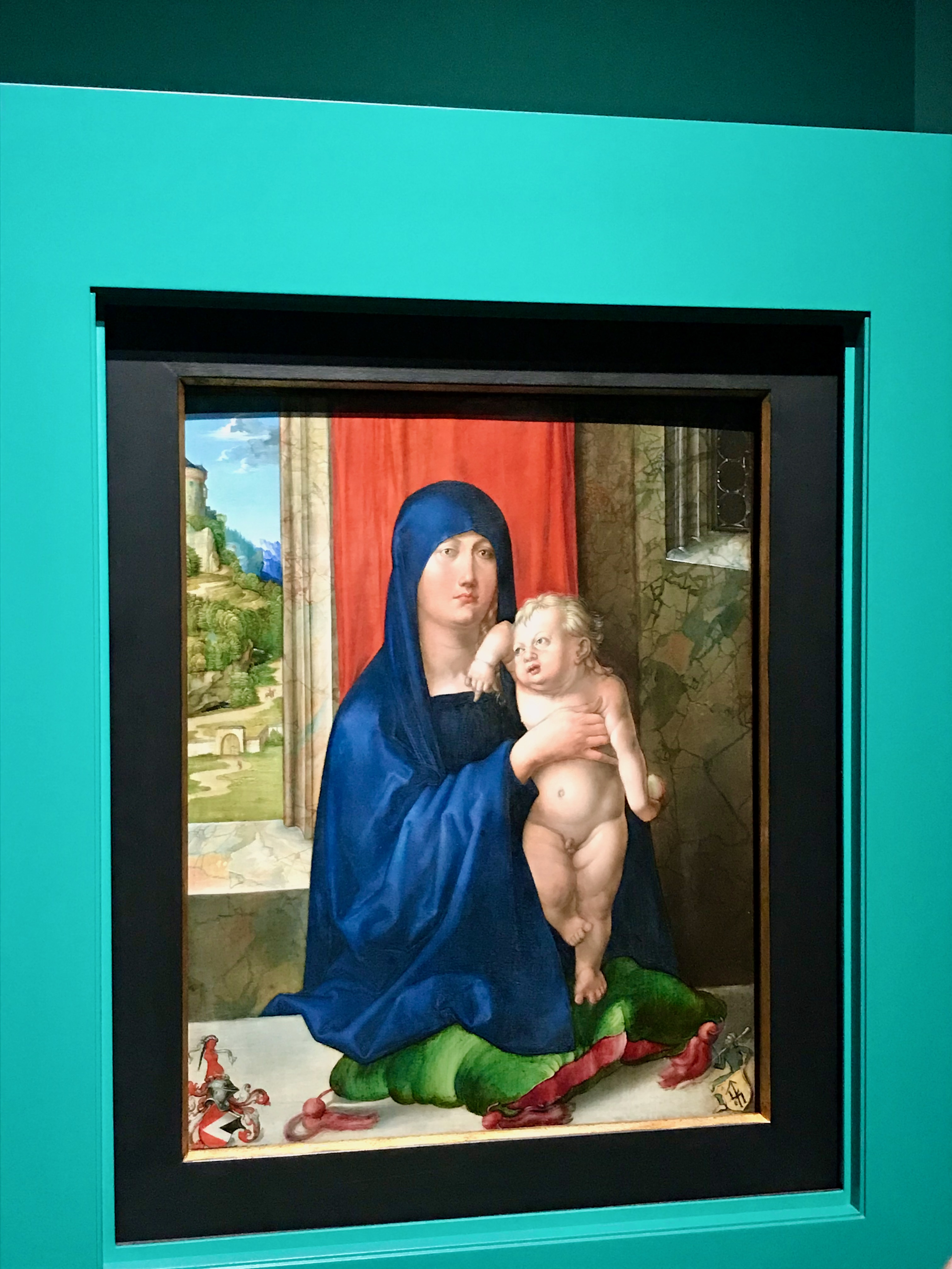 There is another cultural overlay. This painting is called the Haller Madonna, after the family who commissioned the work for their private worship. It features coats of arms in the lower corners, representing prominent families from Dürer’s home town of Nuremberg. The husband’s arms in the left corner represent a noble family while his wife’s on the right are a mason’s mark showing she came from an artisan family. She was moving up in the world!
